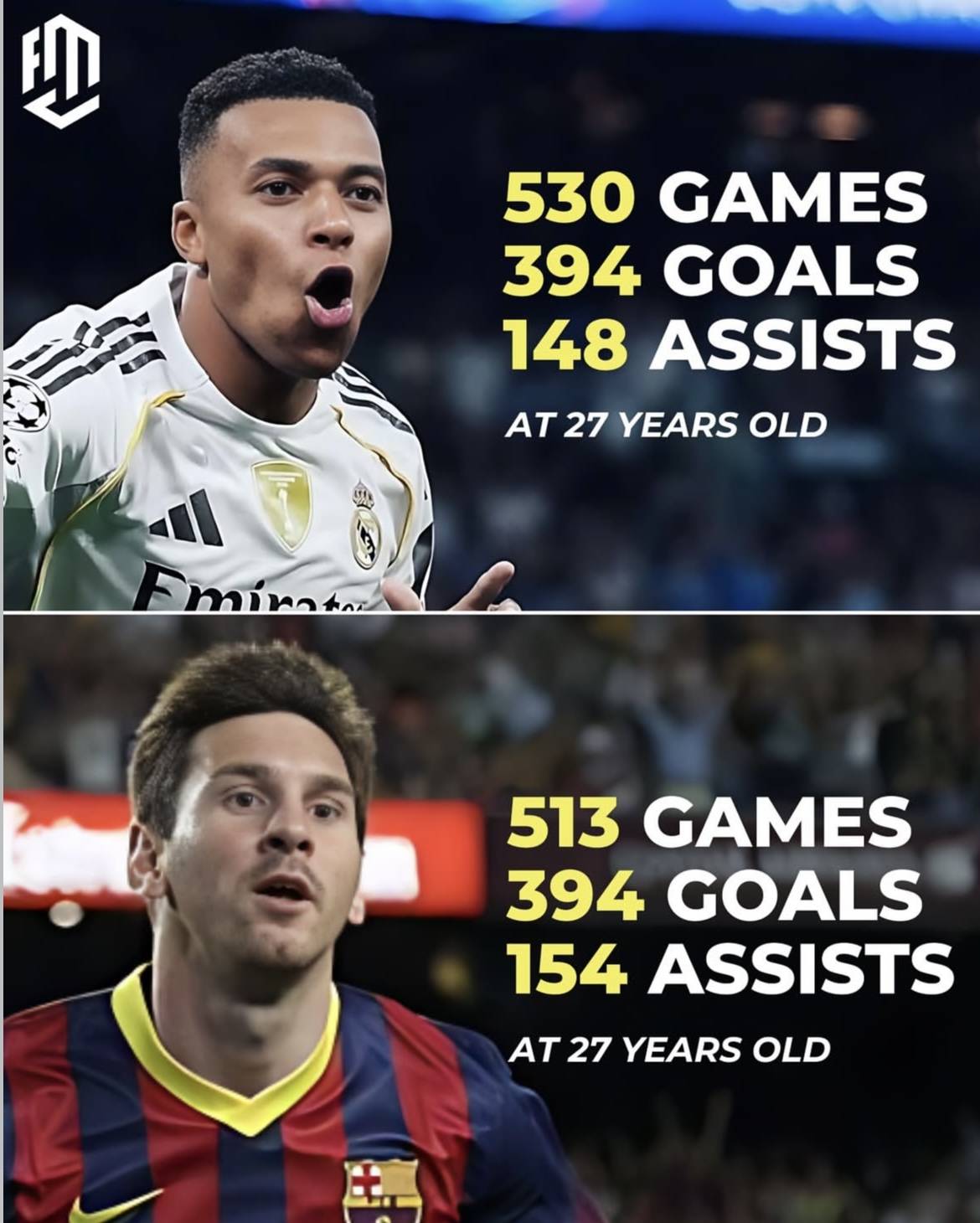 梅西与姆巴佩的27岁前数据对比